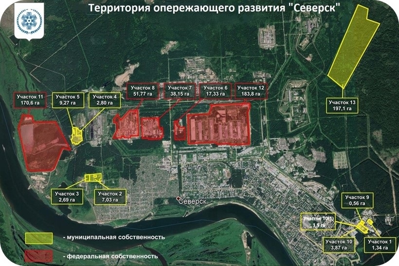 ТОР «Северск» включает 14 земельных участков с общей площадью 688 га, из которых 9 участков относятся к муниципальной собственности и 5 – к федеральной собственности (это выводимые из обращения площадки Сибирского химического комбината с готовой инфраструктурой и мощностями для подключения).